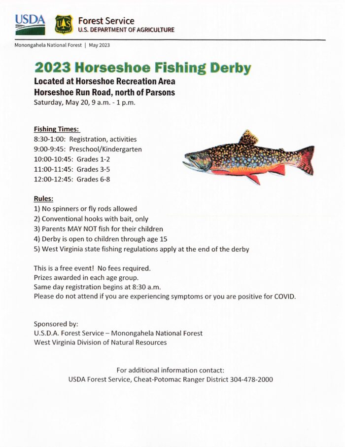 Fishing Derby brian 3 years ago Camp Horseshoe fishing derby for the youth. Stocked specific for the event. Event Date & TimeDate: May 20, 2023Time: 8:30 AM - 1:00 PM(Saturday)