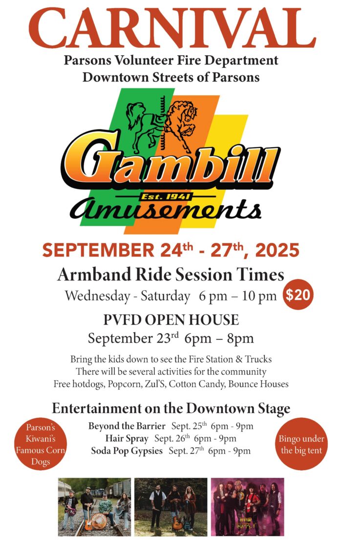 Parsons VFD ANNUAL Homecoming has been in existence since 1941. This annual event features carnival rides by Gambill Amusements, Bingo under the big tent in the streets of Parsons and Nightly Music Acts on the downtown Stage. Additionally on Saturday at 2:00 there is a Parade in the Streets of Parsons. Several Rides, Games and Food Choices Highlight this event.
