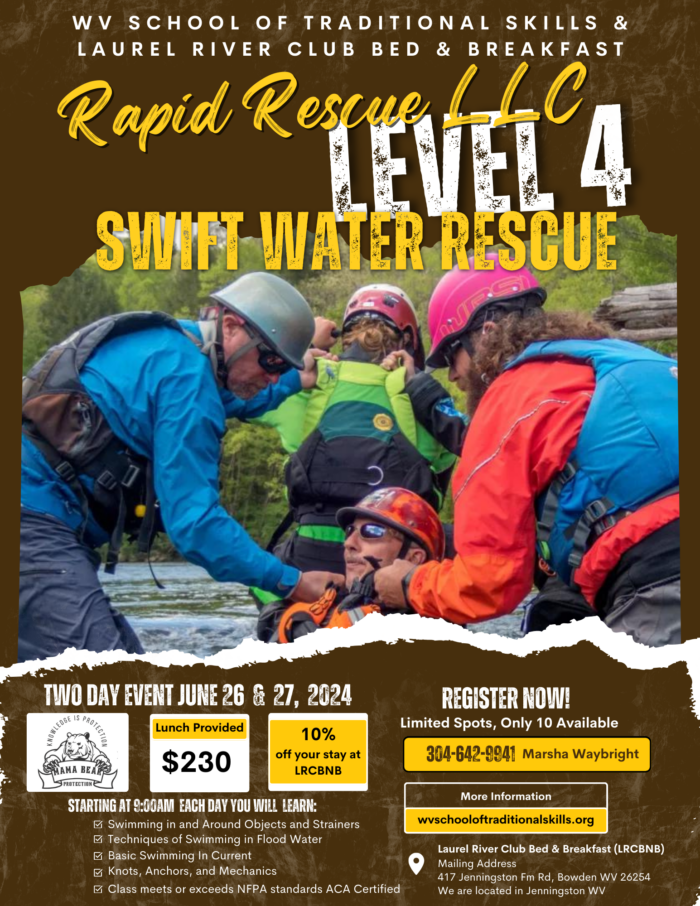 Two Day Event Swimming in and around objects and strainers, techniques of swimming in flood water, basic swimming in current, knots, anchors, and mechanics. This Class meets or exceeds NFPA standards ACA certified. Class will be given by Rapid Rescue LLC