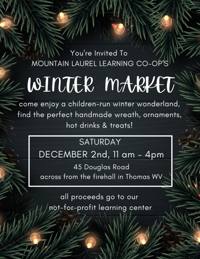 You’re invited to Mountain Laurel Learning Cooperative’s Winter Market! Come enjoy a children-run Winter Wonderland, find the perfect handmade wreath, ornaments, hot drinks, and treats. All proceeds go to our non-profit learning center.